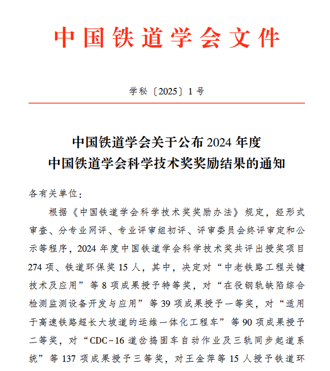 Established in 2002, the China Railway Society Science and Technology Award aims to recognize entities and individuals who have made outstanding contributions in scientific and technological activities in the railway industry. It seeks to motivate science and technology workers, enhance the capacity for railway technological innovation, and accelerate the modernization of railway infrastructure. As the most influential and authoritative award in the railway sector, it bears witness to the industry’s pursuit of excellence and its commitment to pioneering advancements. Furthermore, this prestigious award stands as a monument to the spirit of railway scientists and engineers who dare to scale new heights and lead the way in technological progress.